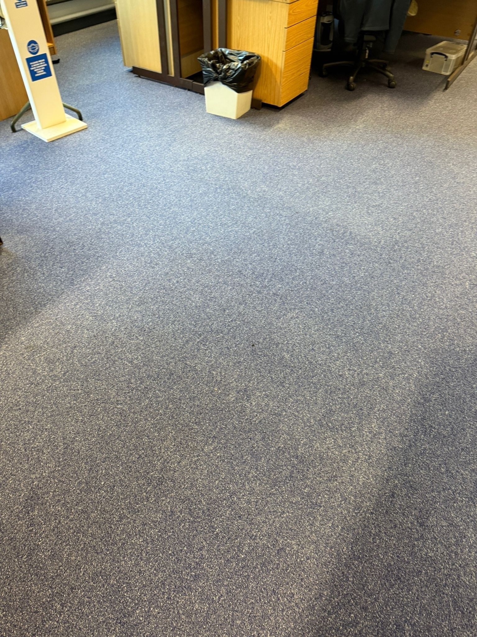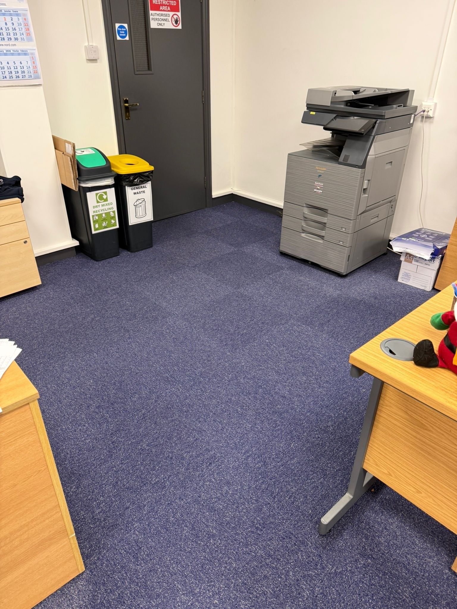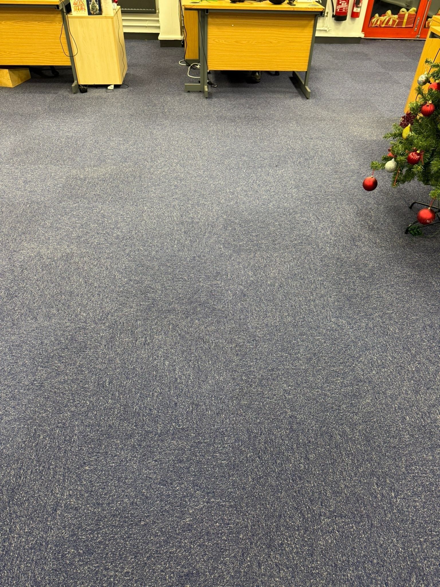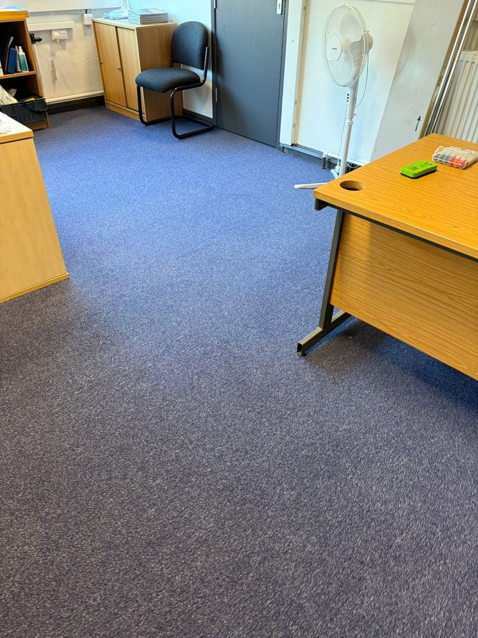 In a recent deep-clean project, a three-person team spent two full days carrying out carpet cleaning across both the main offices and factory offices. Using a low-foam chemical solution combined with a rotary carpet machine, we were able to effectively lift deep-seated stains while ensuring rapid drying times. This minimised disruption and allowed office staff to re-enter their workspaces promptly. As shown in the photos, the results were transformative, the long-installed carpets now appear significantly brighter and stain-free, bringing a fresh, revitalised feel to the interior spaces.